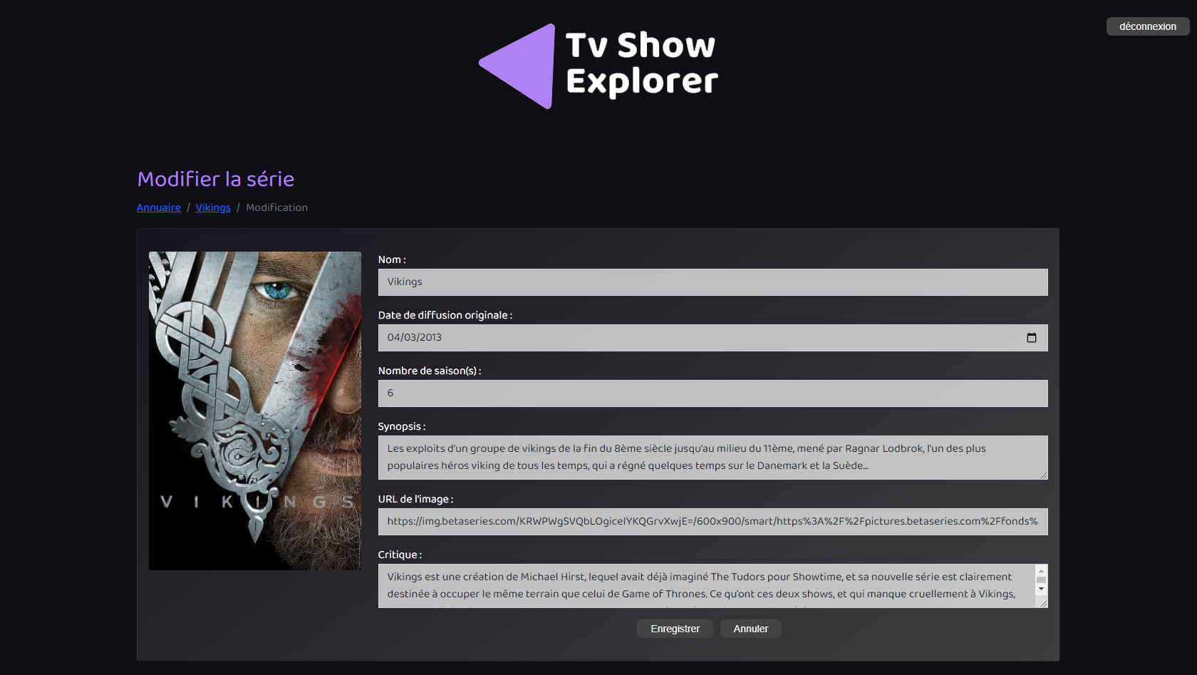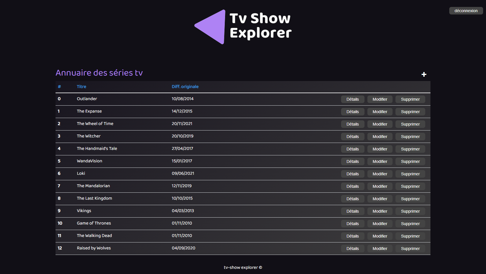 Il s’agissait de réaliser une interface sécurisée permettant de consulter et de gérer du contenu concernant des séries télévisées en vue du développement d’une future API : titre, date de diffusion originale, nombre de saisons, synopsis, critique principale.