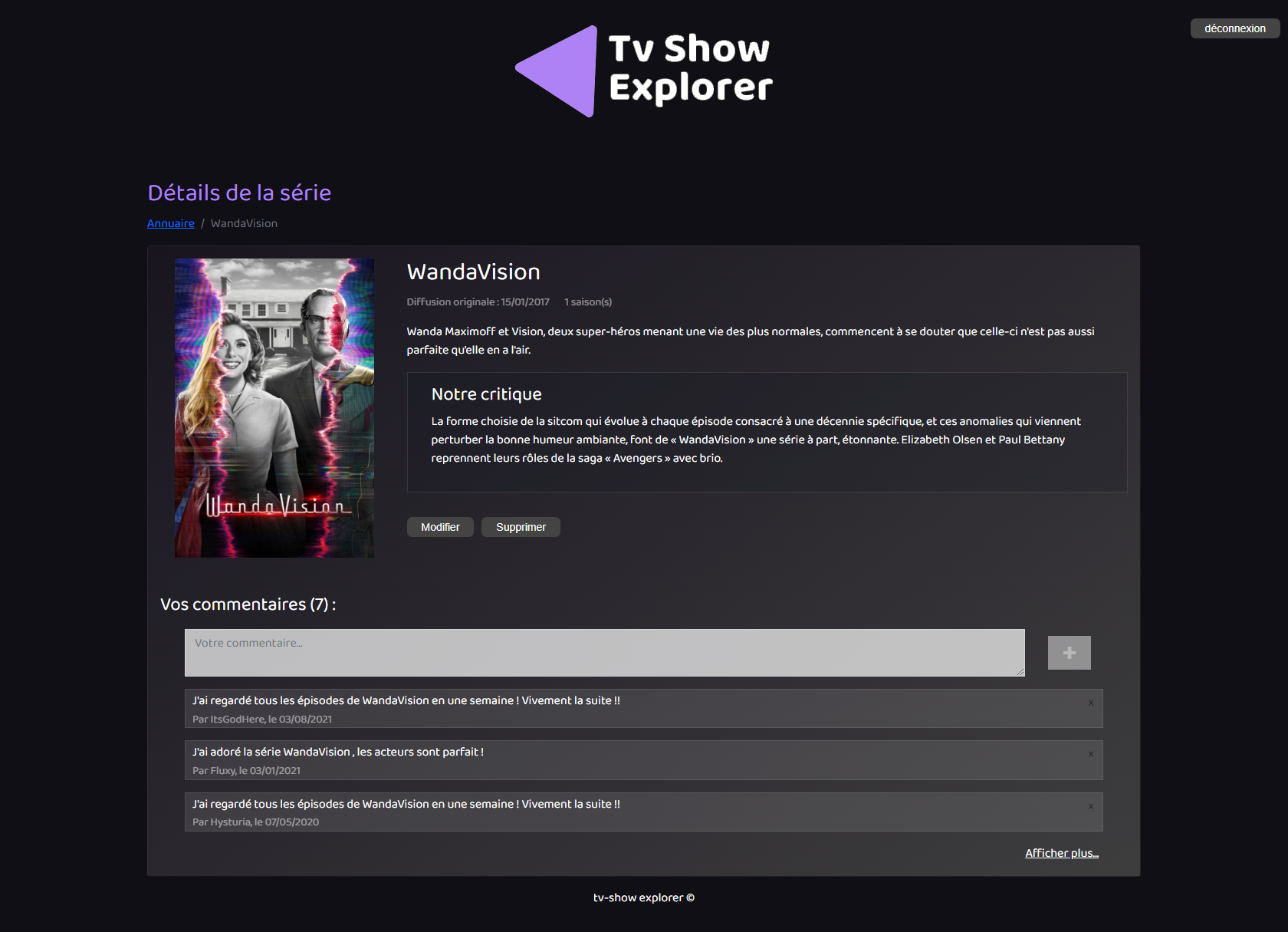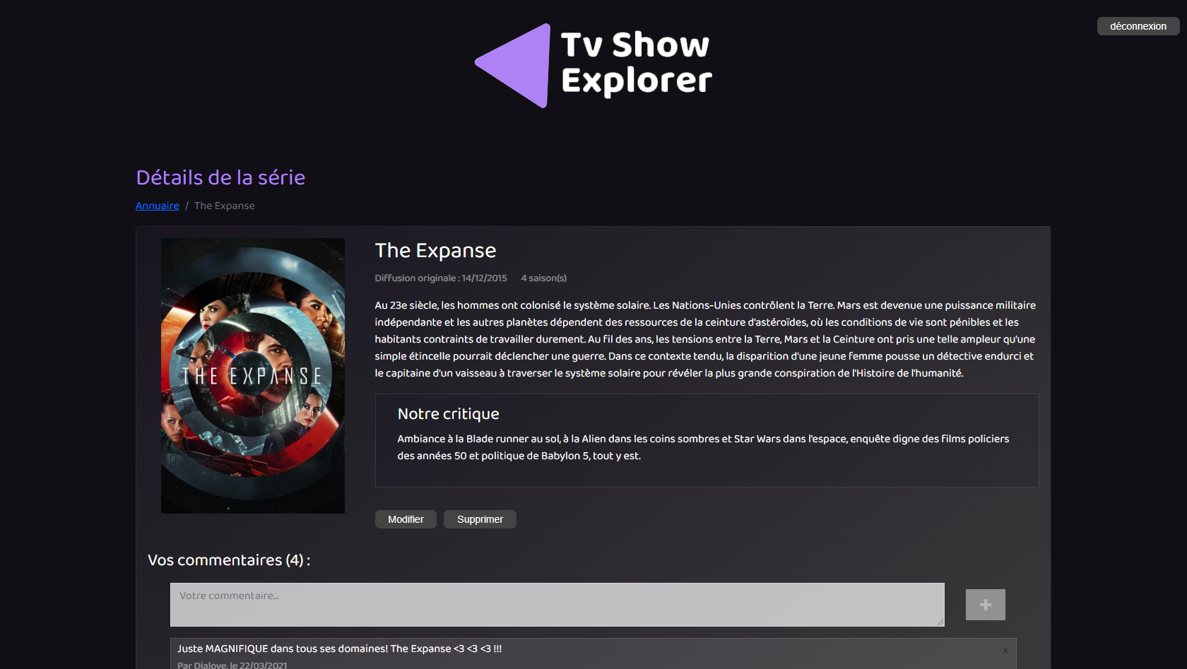 - une vue détaillée de chaque série affichant toutes les informations concernant celle-ci, ainsi que les commentaires qui y sont associés